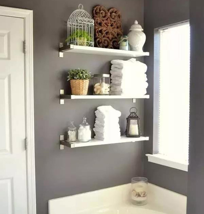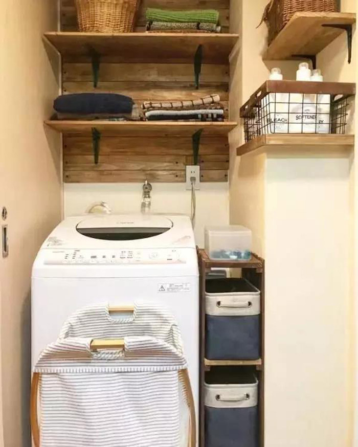 隔板绝对是小户型卫生间的收纳神器。几块木质隔板,就可以马上打造一个储物小空间。此时,可以利用二八收纳法则,把季节性、杂乱性物品放在最里侧,美观整洁、常用物件放在外面随手便于拿取的位置。